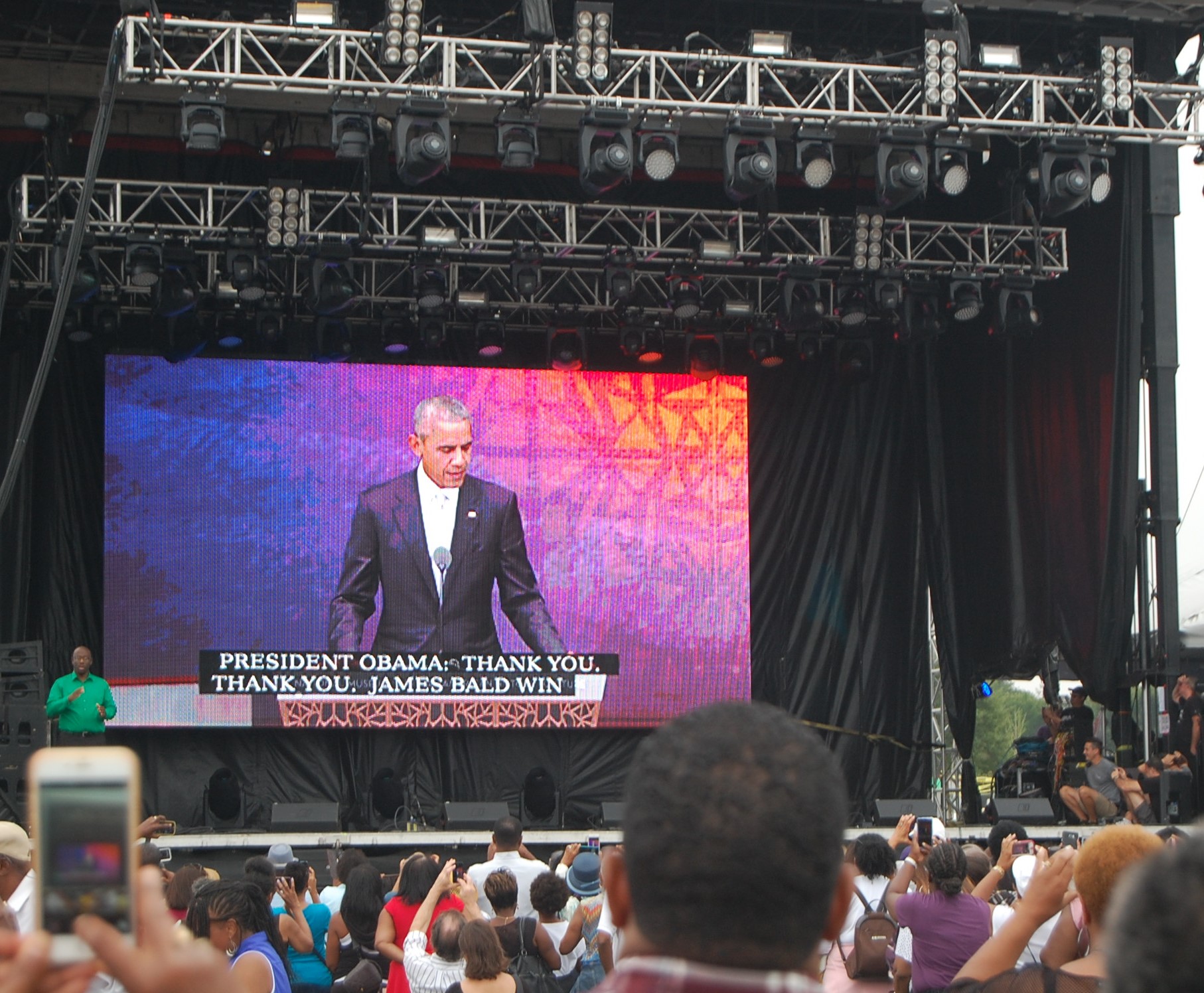 The FREEDOM SOUNDS program of music and poetry share the day with remarks from Smithsonian Museum representatives including founding director Lonnie G. Bunch III, Civil Rights icon Congressman John Lewis, prominent entertainers and former President George W. Bush who signed the legislation to build this museum. When President Obama reaches the podium everybody stands and shouts and cell phone cameras rise in the air. Lots of love is given to the most popular President in decades.