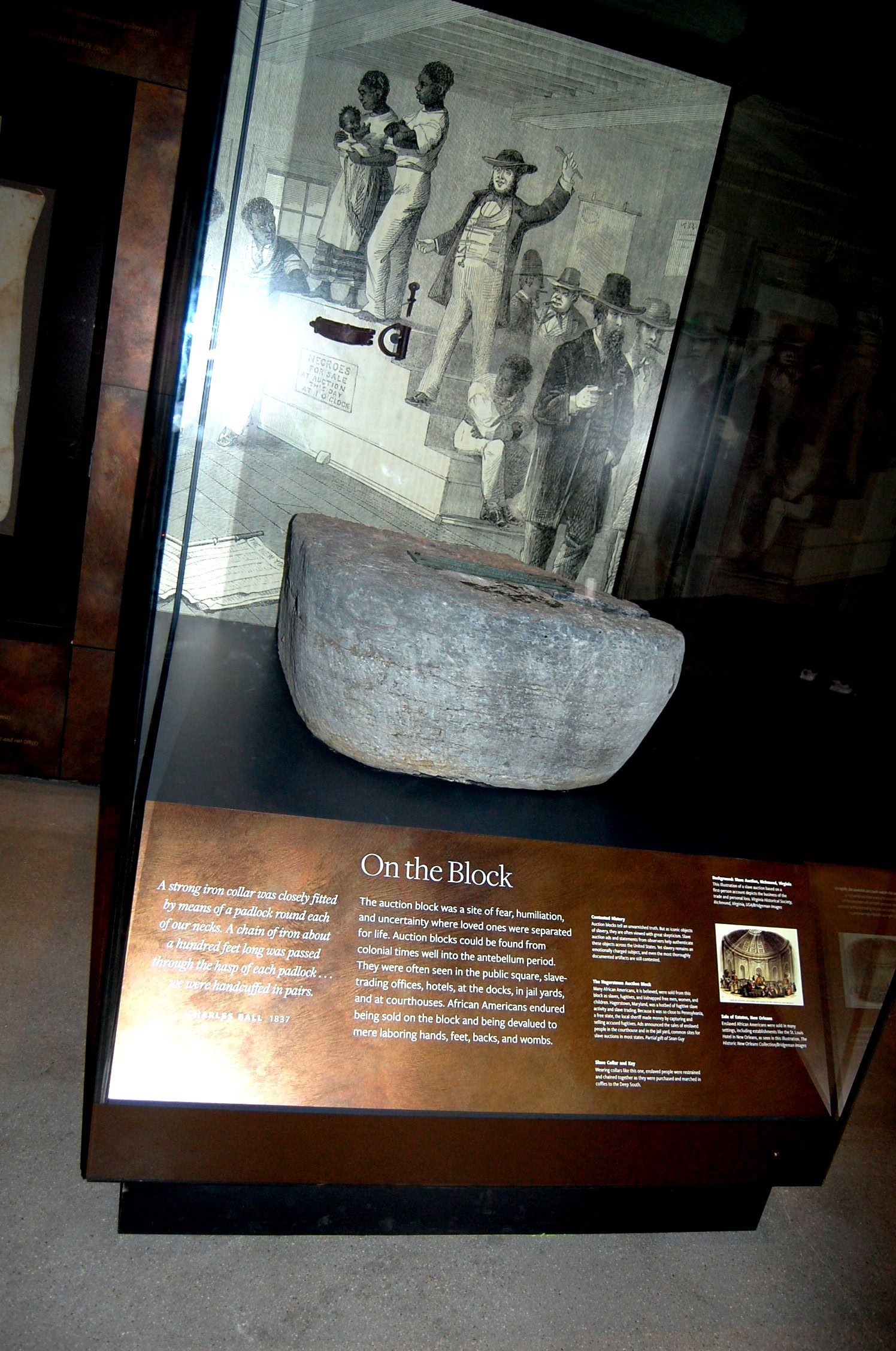 In the belly of the museum, 70 feet below ground is the somber chronicle that begins in the 15th Century when Europeans invade the Motherland. Then the diaspora across the sea from Africa to countries around the globe. The Colonial America experience of the plantation with beatings and family separations are enhanced by a collection of valuable artifacts in displays of photographs, yellowed letters and shackles authenticating the treatment of human beings as if they were livestock.