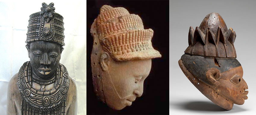 Three depictions of Yoruba crowns