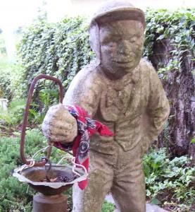 This jockey sits in my garden and for me symbolizes all that is necessary to overcome injustice and intolerance. During the decade of 1850 when the Underground Railroad was at its height, the lawn jockey was a message for fugitive slaves escaping out of the South and into the North. A familiar 19th century ornament by the roadside in front of homes and farms, whichever direction the arm pointed was the way to Freedom. A scarf tied around the jockey’s wrist or neck was confirmation that inside that home or farm lived a believer in anti-slavery. If at night the lantern was lit, it was a message to the weary fugitive that this was a safe place to enter and be out of harm’s way.